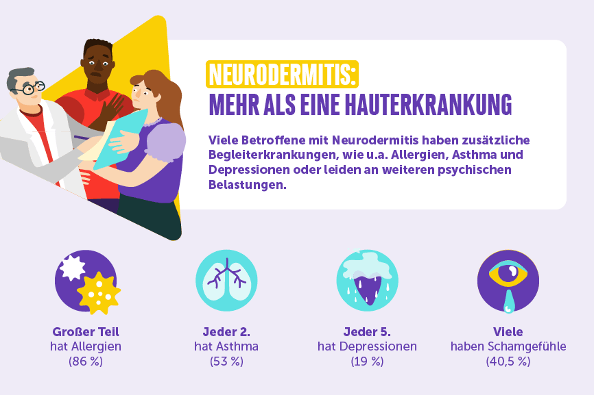 Was vielen nicht klar ist: Neurodermitis ist keine reine Hauterkrankung – sie betrifft den ganzen Menschen. Dazu gehören auch das soziale Umfeld, die Psyche und der Alltag. Besonders betroffen sind Berufstätige: Konzentrationsprobleme, Schamgefühle und Schlafmangel wirken sich unmittelbar auf Leistungsfähigkeit und Wohlbefinden aus. So gab jede*r Zweite (51,8 %) an, Einschränkungen im Berufsleben aufgrund der Neurodermitis zu erfahren.